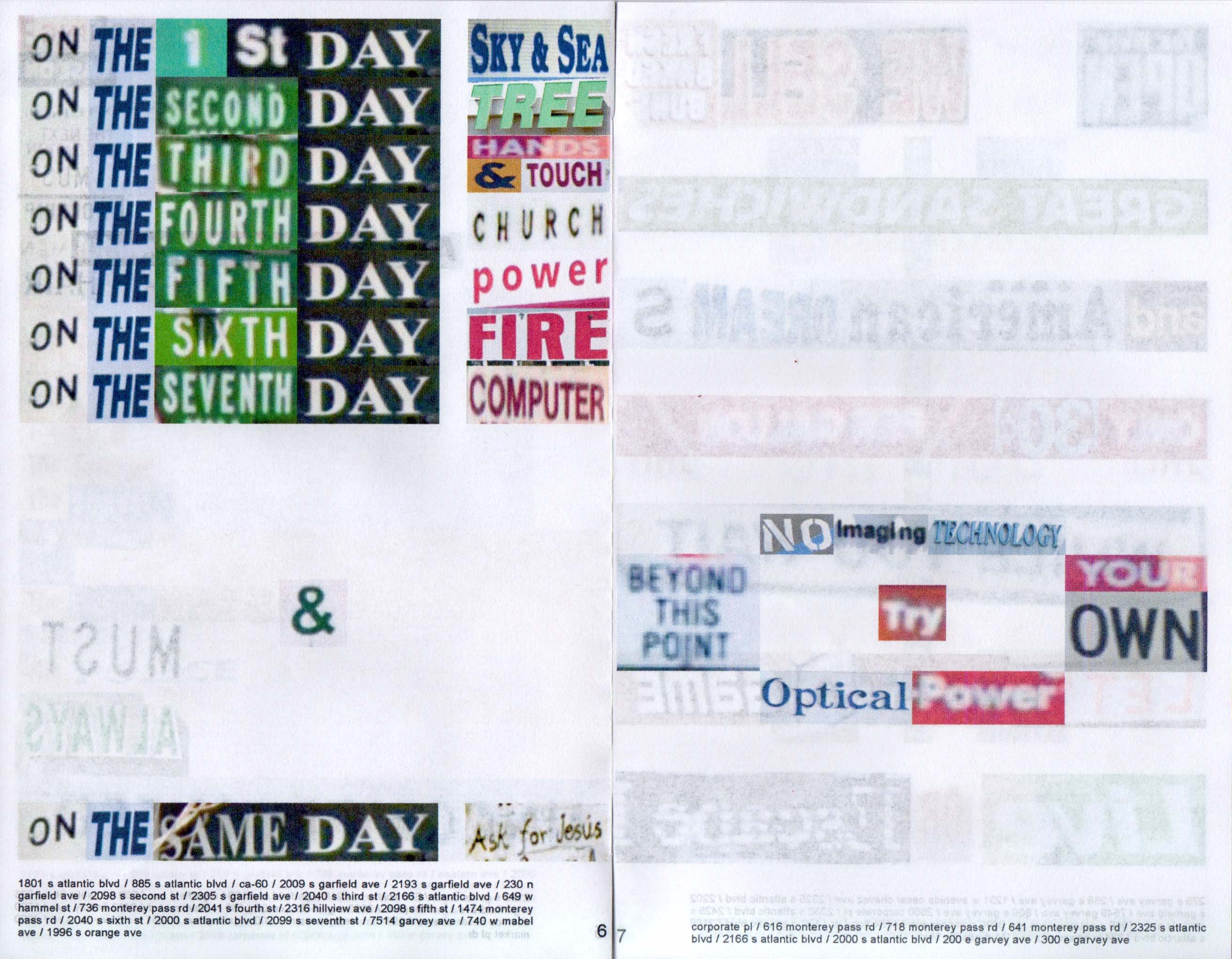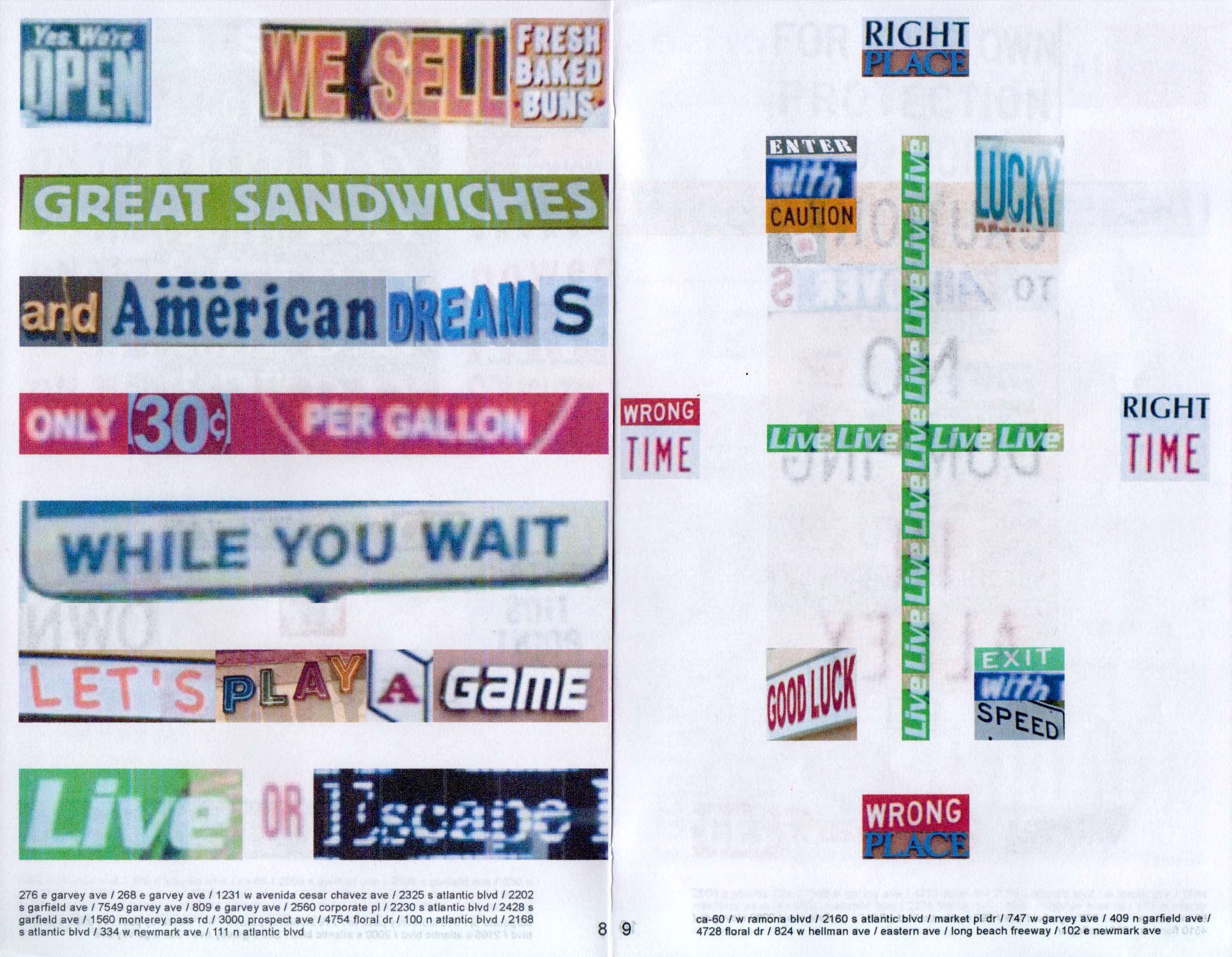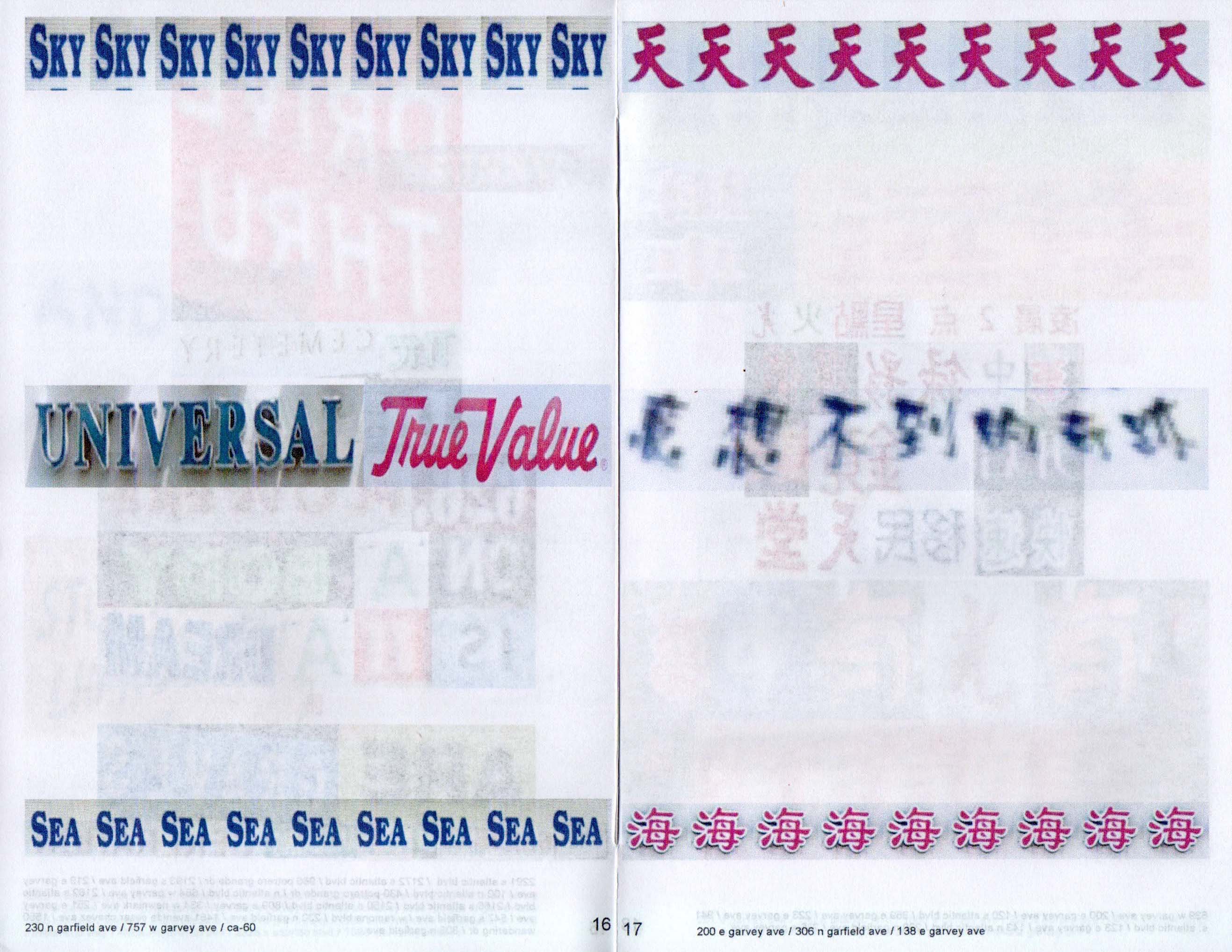 Self-published print and web zines paying tribute to Monterey Park, a city in the San Gabriel Valley in East Los Angeles. The zines consist of poems collaged using screenshots of texts taken from the Google Street View of the city and double as maps for poetically navigating a neighborhood.