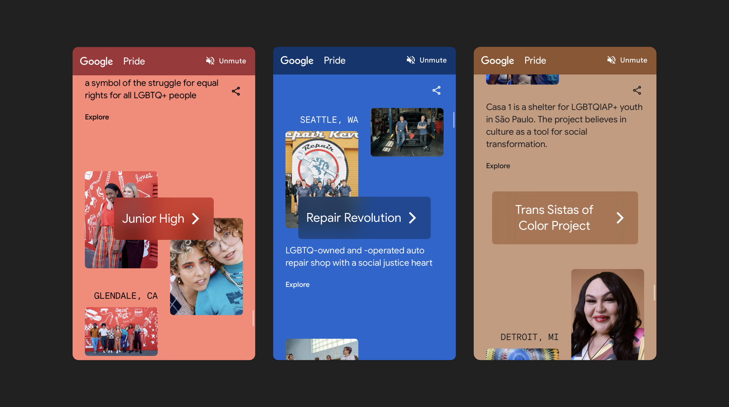 Interactive editorials and poster campaign for an initiative aimed at fostering a sense of belonging at Google. Coinciding with Pride month, the two-part campaign included a series of interviews with LGBTQ+ businesses and organizations using Google’s products, alongside stories of belonging featuring the company’s own employees.